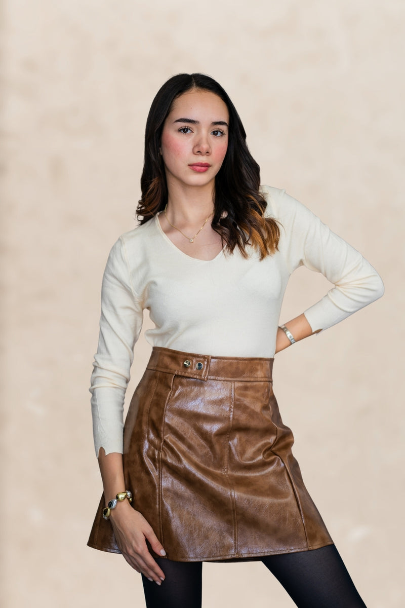 Su diseño en corte A crea una silueta favorecedora que estiliza la cintura y da movimiento al caminar. Fabricada en vinipiel suave, aporta un toque elegante y urbano que eleva cualquier outfit.